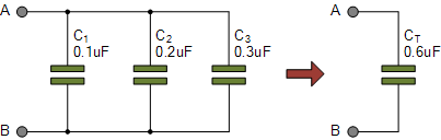 由此可见,含有两个或更多并联电容器的电路的总电容 C_T 等于各电容值之和,这是由于有效极板面积增加所致。