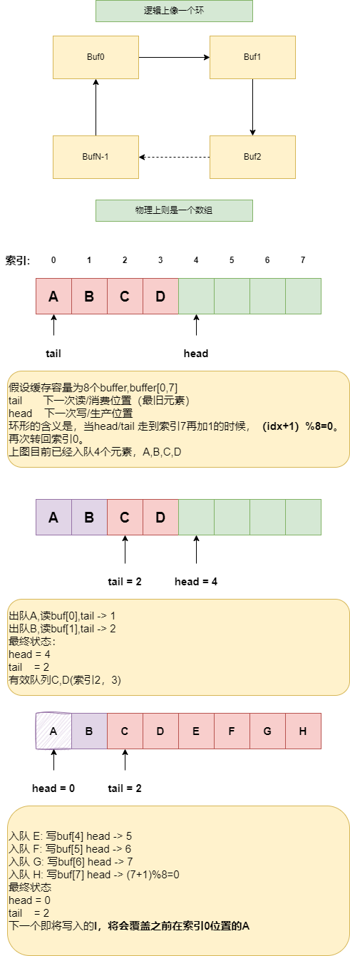 环形缓冲区是一种基础数据结构,底层是一个固定长度的数组 buf[N],有两个索引,head负责下一次写入(生产)的下标,tail负责下一次读出(消费)的下标。每次移动head/tail都是取模(index+1)\% N,就和钟表的指针一样,逻辑上都是绕一圈。它是一个FIFO队列的实现,广泛用于驱动/网卡收发队列,日志缓冲区,音视频及流数据消费。