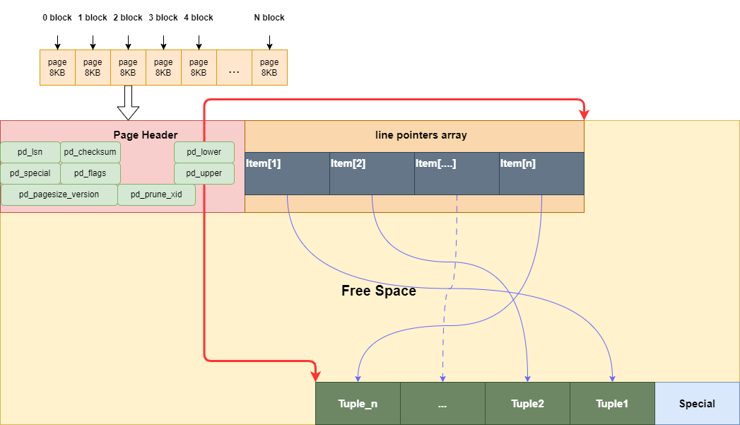 在文件段下一层的存储单位就是页面(page/block),需要注意的是Linux默认的页面大小是4KB,而Postgresql默认的页面大小是8KB。每个页面内部又被分为: 页头->行指针(itemid数组)->空闲区->元组数据->特殊区(多用于索引)
